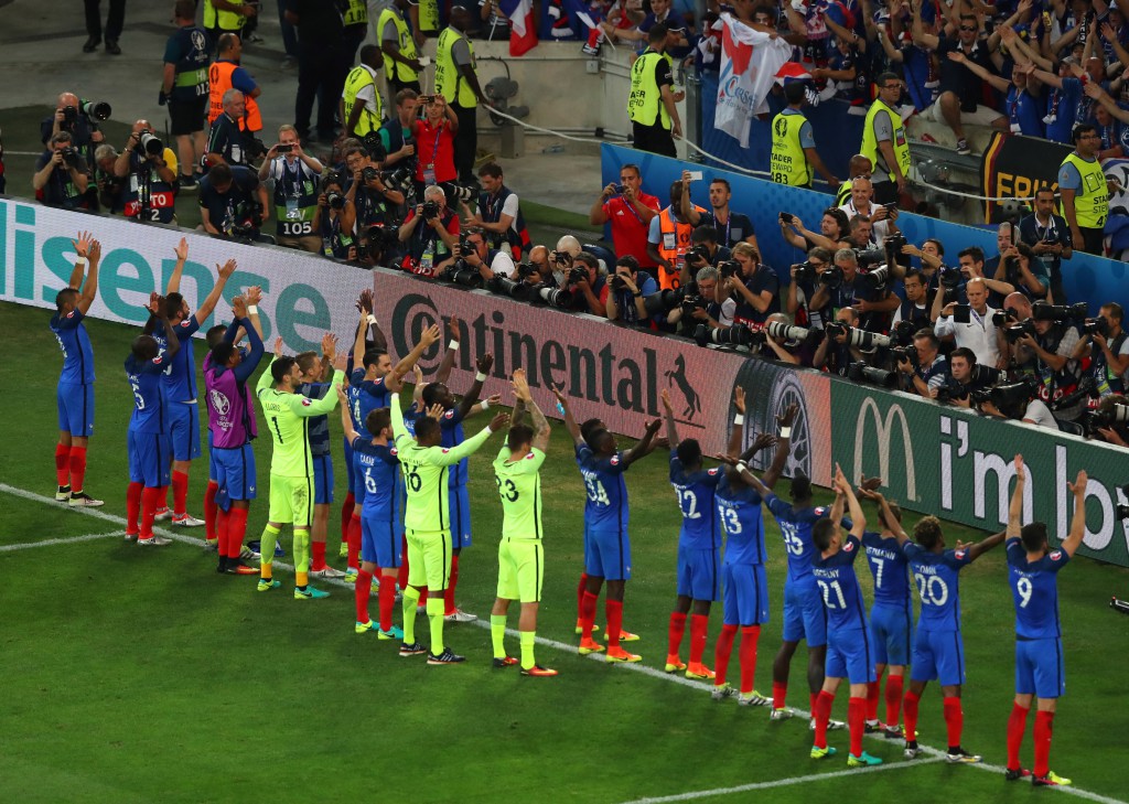 Френските футболисти поздравяват привържениците си след победата над Германия